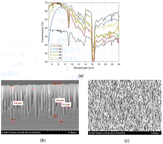 (a) Transmission through Si wafers with approximately 500 µm thickness with B-Si on one side. Upper and lower dashed lines show the theoretical transmission through 500 µm thick Si corresponding to perfect ARC (Equation (1) as ) on one side and no ARC (Equation (1) as ), respectively. Numbers in the legend refer to the sample number in Table 2. (b,c) SEM images of sample #2 taken at cross-section (b) and at 15 (c).