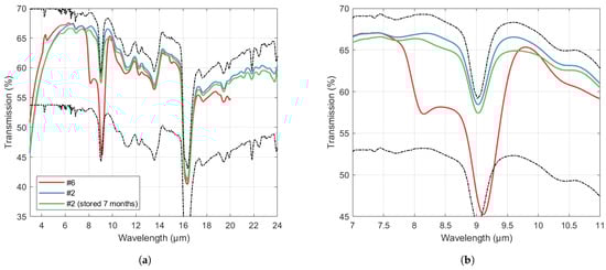 (a,b) Transmission for one-sided B-Si with no oxide etch (sample #6), 4 min oxide etch (sample #2), and 4 min oxide etch stored 7 months in ambient atmosphere. Upper and lower dashed lines show the theoretical transmission through 500 µm thick Si with perfect ARC on one side and no ARC, respectively. (b) shows the zoom-in the wavelength range 7–11 µm.