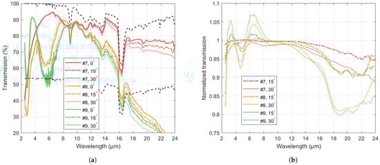 As shown in Figure 6, the DS B-Si wafer shows high transmission from about 7 µm to 24 µm. The drop in transmission when increasing the incidence angle up to is less than 2% up to 13 µm and increasing at longer wavelengths. In comparison, the DS ARC sample shows higher angle-dependence, although the change is less that 2% in the 8–12 µm range, while the ARC-BSi sample shows an intermediate behaviour.