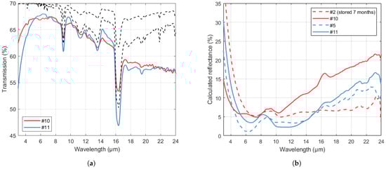 Two samples with B-Si in deep cavities with 390 µm (sample #10) and 180 µm (sample #11) depth, respectively, were fabricated. The measured transmission is shown in Figure 7a. Although the two samples were similar in terms of overall transmission, the thinner Si diaphragm of sample #10 led to less internal absorption for the characteristic 9 µm and 16 µm valleys. The reflectance ) of the B-Si surfaces in cavities and the results for corresponding samples in shallow cavities were calculated by solving Equation (1). The results are an approximation as the extinction coefficient of the processed wafers is likely affected by the etch process, while they are invalid at the lower wavelengths due to scattering. The results are shown in Figure 7b, where it can be seen that the reflectance is lower than 5% in the 8–12 µm range for sample #5. For this recipe, the sample with 180 µm cavity yielded a similar result, with a deviance lower than 3 percentage points between wavelengths from 6 µm to 22 µm. In comparison, for the 390 µm deep cavities, there is a significant difference, with a lower cut-off and higher reflection at longer wavelengths than for the corresponding recipe for shallow cavity. This indicates a deviance in B-Si structure due to the deeper etch, although more experiments would be needed to evaluate if this is a systematic effect.