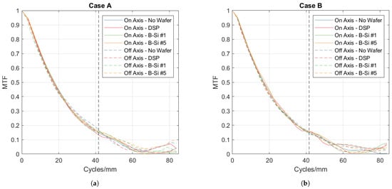 The measured MTF for Case A is shown in Figure 9a. For the on-axis, all cases were performed identically. There was no significant difference between no wafers, DSP wafers, and the single-sided B-Si wafers in terms of the measured MTF.