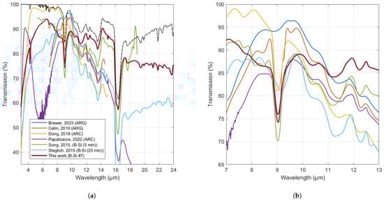 (a,b) Comparison between results obtained in this work and previously published results * for (double-sided) ARCs, ARGs, and B-Si. Dashed line shows the theoretical maximum transmission for perfect (double-sided) ARC for the wafers used here. (b) shows the zoom-in of graph (a) in the range 7–13 µm. Note: Referenced works use CZ Si wafers with 0.5 mm thickness, except (Brewer, 2023) and (Steglich, 2015), who used float zone wafers with 0.5 mm thickness and (Sung, 2015), who used CZ wafers with thickness 345–400 µm. Referenced data were extracted as data points from the published graphs using an online tool (https://apps.automeris.io/wpd (accessed on 13 September 2023)) and interpolated. * Referenced results can be found in [3,4,5,6,21,25].