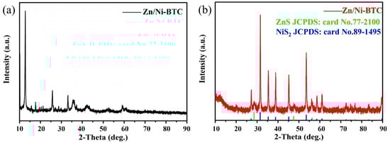 Typical wide-angle XRD patterns of Zn/Ni-BTC (a) and ZnS/NiS2 (b).