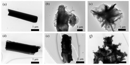 TEM images of (a) Zn-BTC, (b,c) Zn/Ni-BTC, (d) ZnS, (e,f) ZnS/NiS2.