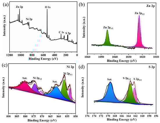X-ray photoelectron spectroscopy (XPS) was applied to explore the surface electron states of ZnS/NiS2. As shown in Figure 4a, the characteristic peaks in the full measurement scanning spectrum confirmed the existence of Zn, Ni and S elements, which are consistent with XRD and EDX results. As revealed by Figure 4b, the Zn 2p exhibited two peaks of Zn 2p3/2 (1021.3 eV) and Zn 2p1/2 (1045.3 eV), which originated from ZnS [26]. Figure 4c presents the spectrum of Ni 2p with six peaks. The peaks centering at 853.1 eV and 871.4 eV can be indexed to Ni2p3/2 and Ni2p1/2 of Ni(II), while peaks at 857.2 eV 874.6 eV belong to Ni2p3/2 and Ni2p1/2 of Ni(III). Moreover, two satellite peaks (862.5 eV and 880.1 eV) were observed for Ni(II) and Ni(III), respectively [27,28]. A Ni(III)/Ni(II) ratio of 9:5 was found based on an analysis of XPS data. As far as S 1s is concerned, three peaks are observed, as shown in Figure 4d. There are two peaks corresponding to the S 2p3/2 and 2p1/2 orbitals of S at binding energies of 162.5 and 163.4 eV, respectively. This result evidences the existence of a metal–S (Zn-S and Ni-S) bond. Owing to the surface oxidation, the characteristic signal of S species with a high oxidation state is observed at 169.4 eV [29,30].