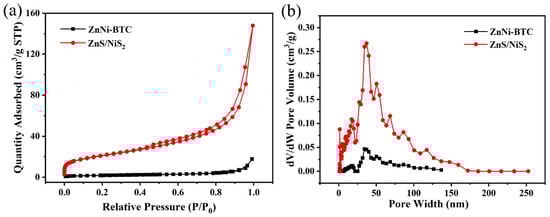 Both Zn/Ni-BTC and the final synthesized ZnS/NiS2 heterostructures are expected to be rich in porous structures. Thus nitrogen adsorption–desorption measurement was carried out to determine the specific surface areas and porosity of Zn/Ni-BTC and ZnS/NiS2. As shown in Figure 5a, ZnS/NiS2 possesses a much higher adsorption amount of N2 compared to Zn/Ni-BTC, revealing that ZnS/NiS2 exhibits a larger surface area than Zn/Ni-BTC. This result demonstrates that solid vulcanization under high temperature brings out more pores in the sample. Additionally, both curves could be ascribed to type IV. On the basis of the N2 adsorption–desorption isotherm curve, the BET surface areas of the ZnS/NiS2 and Zn/Ni-BTC are calculated to be 74.88 m2/g and 6.89 m2/g, respectively. The increase in the BET surface area could correspond to the decomposition of Zn/Ni-BTC materials at a high temperature and the formation of pore-rich sulfide, which were observed in the SEM and TEM images. As can be seen from Figure 5b, the pore size of Zn/Ni-BTC is mainly located in the range of micropores and mesopores, while the ZnS/NiS2 heterostructure has several larger pores. Such porous features are beneficial for mass/ion transfer with a high rate, which is critical for improving electrochemical reaction kinetics [31]. The high surface area of ZnS/NiS2 will provide rich defects and pores, which are conducive to accelerating electron transfer and the transport of reactants to active sites [32]. Thus, the specific capacitance and charge discharge rate capability are expected to be greatly improved.