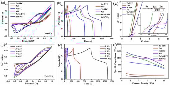 Electrochemical behaviors of Zn-BTC, ZnS, Ni-BTC, NiS, Zn/Ni-BTC and ZnS/NiS2 electrodes. (a) CV profiles at 20 mV/s. (b) GCD profiles at 1 A/g. (c) EIS plots. (d) CV profiles of ZnS/NiS2 within 10–50 mV/s. (e) GCD curves of ZnS/NiS2 within 1–10 A/g current density. (f) Plots of specific capacitance vs. current density of Zn-BTC, ZnS, Ni-BTC, NiS, ZnNi-BTC and ZnS/NiS2 electrodes.