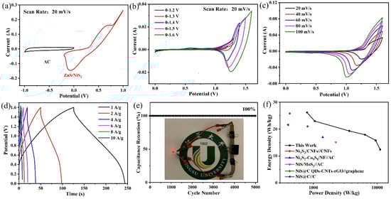 To demonstrate the feasibility of ZnS/NiS2 in energy storage devices, we fabricated asymmetric supercapacitor devices by using the ZnS/NiS2 as the cathode and the commercial activated carbon (AC) as the anode material (ZnS/NiS2//AC). The electrochemical performances of the AC were studied using CV and GCD measurements (Figure S6a,b). The AC showed nearly rectangular shapes and presented a specific capacitance of 121 F/g at a current density of 1 A/g. According to the charge balance, the mass of active materials on the anode and cathode is 1:5. As shown in Figure 7a, corresponding CV curves of AC and ZnS/NiS2 showed typical electric double-layer capacitance and obvious pseudocapacitive behavior, respectively [42]. By varying the voltage window and keeping the scan rate at 20 mV/s, a series of CV curves were measured, which demonstrated that the maximum operation potential window could reach up to 1.6 V and could avoid water decomposition effectively (Figure 7b) [43]. The device shows CV curves from 20 to 100 mV (Figure 7c), indicating a good charge mechanism with reversible behavior. Typical GCD curves at different current densities between 1 and 10 A/g in the voltage window of 0−1.6 V are illustrated in Figure 7d, showing a symmetric shape and indicating the good Coulombic efficiency and excellent reversibility of ZnS/NiS2//AC. This device achieves a specific capacitance of 73.8 F/g and 35 F/g at current densities of 1 A/g and 10 A/g, respectively (Figure S7). The cyclic stability is carefully studied as one of the important parameters to determine the practicability of the device. The device shows an excellent cycle stability of 100% initial capacity at a current density of 10 A/g after 5000 cycles (Figure 7e). And, we fabricated two asymmetric supercapacitors and lighted a red LED successfully, as shown in the inset of Figure 7e. Finally, a Ragone plot was used for the comparative performance evaluation of the ZnS/NiS2//AC ASC device, which exhibited a maximum energy density of 26.3 Wh/kg at a power density of 794 W/kg, with 12.4 Wh/kg remaining at a power density of 1.1 kW/kg, which is higher than what was previously reported (Figure 7f), i.e., Ni3S2/CNFs//CNFs (25.8Wh/kg at 425 W/kg) [44], Ni3S2-Co9S8/NF//AC (17 Wh/kg at 1.4 kW/kg) [45], NiS/MoS2//AC (15.1 Wh/kg at 2.25 kW/kg) [46], NiS@CQDs-CNTs-rGO//graphene (21 Wh/kg at 811 W/kg) [47] and NiS@C//C (21.6 Wh/kg at 400 W/kg) [48]. All findings are also compared with the existing literature using data in Table 1. All of these demonstrate the excellent performance of the fabricated asymmetric device.