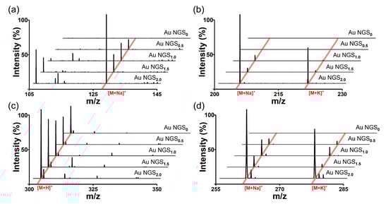 LDI–TOF mass spectra of small molecules obtained for the SiO2@Au NGS0–2.0 matrices: (a) serine, (b) mannitol, (c) quercetin, and (d) pentaethylene glycol.