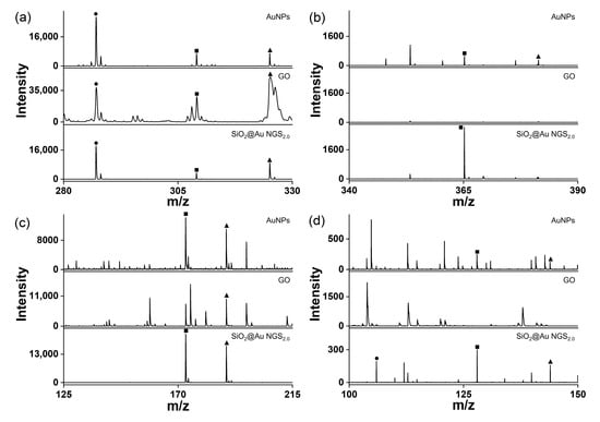 LDI–TOF mass spectra of small molecules obtained using the AuNP, GO, and SiO2@Au NGS2.0 matrices: (a) kaempferol, (b) cellobiose, (c) triethylene glycol, and (d) serine. ●: [M+H]+, ■: [M+Na]+, and ▲: [M+K]+.