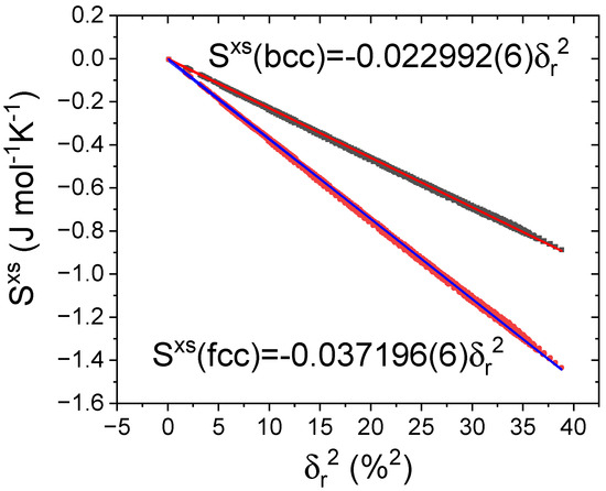In fact, even in single-phase solid solution systems, the assumption of complete disorder used for is an idealization. corresponds to an overestimated limit because the larger atoms tend to distort the lattice in such a way that they are preferentially surrounded by smaller ones. The excess entropy, , was estimated within the framework of the hard sphere model by Mansoori et al. [16]. Despite its complex dependence on and of the constituents, as well as on the packing fraction, , (see [11,16]), simple linear relations with can be approximated for bcc and fcc structures (though the slope slightly varies for different alloy series). Figure 1 shows this linear fitting (regression coefficient >0.9999) for the CoFeNiCryMnzAlx family within the ranges , , and .