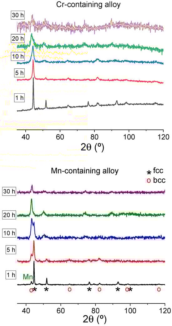 The experimental compositions determined through XRF closely align with the nominal compositions. The Fe and Cr contents may slightly increase due to contamination from the milling media (in the Cr-free composition, the Cr content remains below 0.5% after 30 h milling). Both Co and Ni exhibit a similar trend, with a slight decrease to compensate for the increase in Fe and Cr content. Finally, Al seems to progressively decrease with milling time, although, as the lightest element among those studied here, its measurement carries a larger margin of error. The estimated experimental compositions after 30 h of milling are Al0.7Co1.0Cr1.0Fe1.0Ni0.9 and Al0.76Co0.96Cr0.02Mn1.00Fe1.06Ni0.96 for the Cr- and Mn-alloys, respectively.