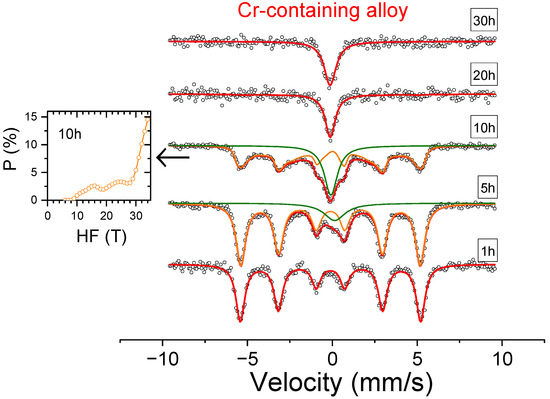Mössbauer spectra of Al0.75CoCrFeNi alloy as a function of milling time. Circles correspond to experimental data. Thick red lines correspond to total fitting. Orange curves correspond to ferromagnetic contribution, and green curves correspond to paramagnetic contribution. Inset shows the probability of ferromagnetic contribution for a sample milled for 10 h, the spectrum of which was fitted using a distribution. Other contributions were fitted using a single site.
