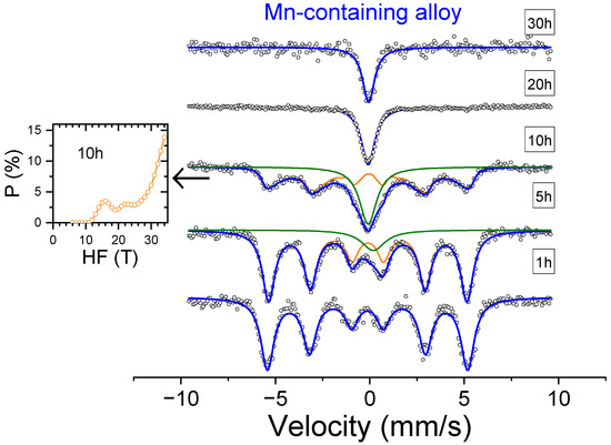 Mössbauer spectra of Al0.75CoMnFeNi alloy as a function of milling time. Circles correspond to experimental data. Thick blue lines correspond to total fitting. Orange curves correspond to ferromagnetic contribution, and green curves correspond to paramagnetic contribution. Inset shows the probability of ferromagnetic contribution for a sample milled for 10 h, the spectrum of which was fitted using a distribution. Other contributions were fitted using a single site.