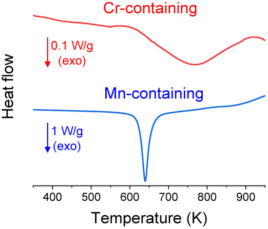 The stability of the single-phase fcc solid solution achieved after 30 h of milling was studied by means of DSC scans, as depicted in Figure 5. The processes shown are irreversible, as a second run does not reveal any additional deviations from baseline. This figure shows that the Mn-alloy displays a more well-defined transformation with a peak temperature at 640 K and an enthalpy of transformation of 162 J/g. In contrast, the Cr-alloy exhibits a much broader transformation, with a peak temperature at 768 K and a transformation enthalpy of 54 J/g.