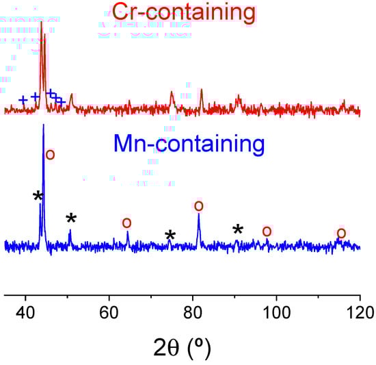 In order to understand the effect of these transformations, XRD experiments (Figure 6) were performed at room temperature after DSC scans (maximum heating temperature, 973 K). The XRD patterns confirm the irreversible nature of the transformations detected via DSC. The microstructures of the annealed samples exhibit a multiphase character, with the coexistence of bcc and fcc phases. Additionally, a sigma phase is detected for the Cr-alloy. This finding aligns with results reported for annealed AlCoCrFeNi at 1073 K after short-duration milling [30]. In qualitative agreement with the transformation enthalpy measured via DSC, the transformed fraction from fcc to bcc phase is higher in the case of the Mn-alloy.