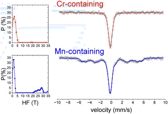The Mössbauer spectra of annealed samples (Figure 7), after heating to 973 K during DSC, indicate that Fe atoms mainly remain in the fcc paramagnetic phase. In the case of the Cr-alloy, no ferromagnetic Fe sites are detected, while for the Mn-alloy, some magnetically-ordered contribution is observed, which corresponds with the larger amount of bcc phase in this composition.