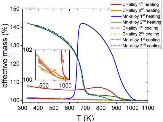 Regarding the Cr-alloy, although the magnetization is higher for the as-milled samples, there is no sudden process during the first heating, which aligns with the DSC scan. At around 925 K, the magnetization drops to zero in a similar way to that observed in the Mn-alloy. With further cooling, a rise in magnetization is not detected at this temperature but, rather, a gradual increase starting at approximately 800 K. Subsequent heating shows a tiny effect at ~750 K, which is not observed during the first cooling or the second cooling. However, this effect is reversible, as it is observed in subsequent heating scans (not shown here). Therefore, similar to that in the Mn-alloy, it appears that some hysteretic process occurs at elevated temperatures in the Cr-alloy.