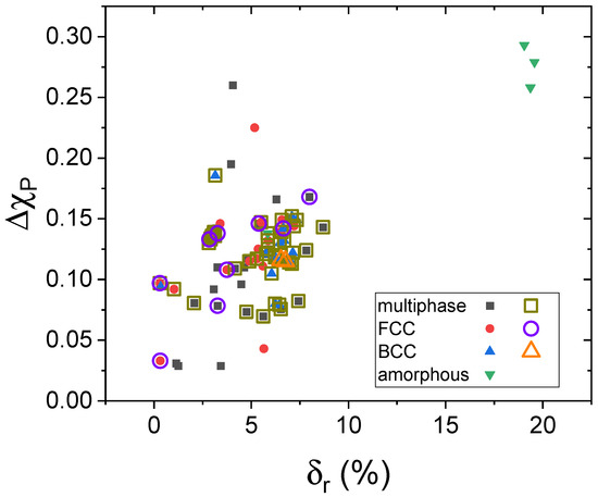 This analysis was extended to other compositions, encompassing quinary and sexinary alloys, involving a total of 16 elements, as referred to by Gorban et al. [15]. It is worth noting that in the case of the equiatomic ReMoWNbTa alloy, a single alloy with a bcc phase was observed with , but with a low atomic radii misfit (). It is important to mention that distinguishing disordered bcc from ordered (or partially-ordered) B2 phases can be challenging due to similar average atomic scattering factors. However, the ordered structure may significantly affect the required parameter due to the accommodation of larger and smaller atoms on different sites. Nevertheless, this site preference causes the entropy value to deviate from the estimated , assuming the global composition.