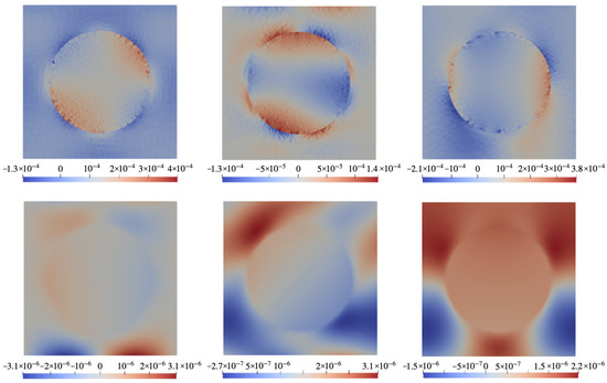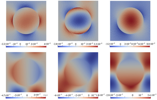 Color maps of mechanical stress σ and electric potential in plane of the cell with configuration B (Figure 2b) under field directed along for a CFO-like particle with ppm. Top row: components (left), (center), (right); bottom row: electric potential under poling directions (left), (center), (right).