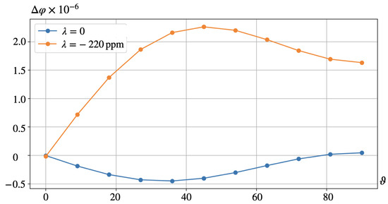 More important is that Equation (13) renders the parameter dependences which point out the relative roles of the effects. For instance, it predicts that under lower values of , like those for magnetite FeO ( ppm [33,34,35]) or NdFeB ( ppm [36]), let alone barium ferrite BaFeO ( ppm [37]), the magnetorotational mechanism of generating the electric response may become fully comparable with the magnetostrictive one and even exceed the effect of the latter. The same enhancement might be encountered as well if to deal with softer polymer matrices, like those of specially prepared PVDF films whose Young moduli range GPa, see [14,38]. Besides that, under a fixed direction of the applied field, even the sign of the effect might change, see the curves in Figure 5.