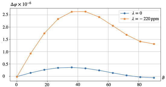 Configuration B, see Figure 2b. Dependence of the transverse voltage on the orientation of the piezoelectric axis for ppm and .