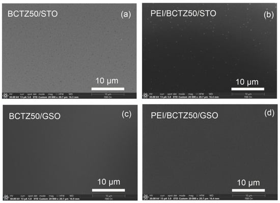 SEM images of thin films deposited on (STO) heated at 700 °C in mbar of oxygen (a) BCTZ50/STO; (b) PEI/BCTZ50/STO; (c) BCTZ50/GSO and (d) PEI/BCTZ50/GSO.