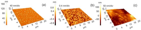 In contrast with the BCTZ samples, the main characteristic for the PEI/BCTZ layered coatings, as confirmed by both SEM and AFM analysis, is a low roughness on the surface, as can be seen in Figure 1b and Figure 2c. MAPLE-deposited PEI layers were smooth, with no cracks, and the two employed analysis techniques revealed uniformly distributed films, covering the entire surface of the probes, in accordance with other studies published in the literature [45].