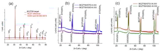 XRD patterns of the BCZT. (a) BCTZ standard card ICDID card no. 00-063-0614 and BCTZ50 target; (b) thin films deposited on GSO with 8000 laser pulses; (c) thin films deposited on STO with 36,000 laser pulses.