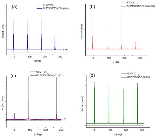 XRD four-circle Φ scans around (101) BCZT reflection for (a,b) BCTZ/STO films with different thickness and (c,d) BCTZ/GSO films with different thickness.