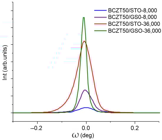 With the improved mosaicity, the crystallinity of the thicker-strained relaxed films is clearly emphasised by the broadness of rocking curves in the BCZT (002) plane, as presented in Figure 5. However, for the thin films deposited onto GSO substrates, one should bear in mind the actual orthorhombic symmetry of the substrate which induces anisotropic strains in the BCZT films, which generates interesting structural features [49].