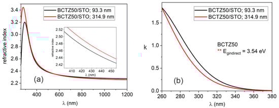 For the band gap calculation, Tauc plotting was employed [46]. By plotting the absorption coefficient α (α = 4πk/λ) as a function of photon energy (eV), the values of the band gap are obtained. BaTiO3 (BTO) in a tetragonal structure presents with an indirect band gap [47], with an energy value of 3.41 eV. Instead of BTO, the value of the indirect band gap for BCTZ50 grown on STO substrate was found be higher, Egindirect = 3.54 eV.