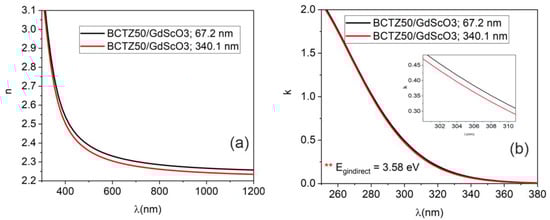 The values of optical constants for the BCTZ50 thin layers deposited on GdScO3 substrate at (a) 8000 and (b) 36,000 laser pulses: (a) refractive index and (b) extinction coefficients. In caption zoom of exctinction coefficients for samples in UV spectral region