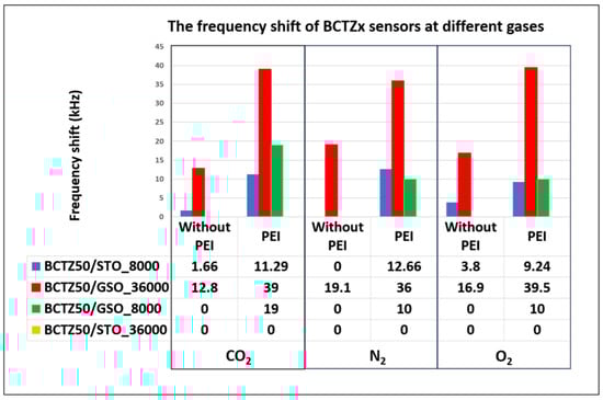 By ading a polymer layer (PEI in this case), the mecanism behind overall response was changed. This time, the gas molecules were absorbed by the PEI layer, and because BCTZ is a piezoelectric material, changing the mass of the polymeric cover layer induced a response in the BCTZ film. The frequency shifts in samples with a polimeric layer were around 9–11 KHz for CO2 and O2, and this is normal behavior for PEI [59].