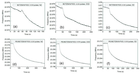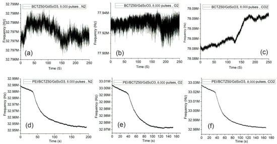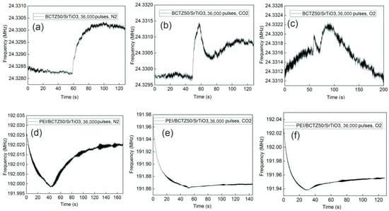 When the number of laser pulses increased to 36,000 and the thickness of BCTZ50/STO layer increased more than three times, a strange behaviour was observed in the gas response. For N2 in the case of the BCTZ50/STO with a thickness of ~300 nm the frequency response was noisy, but when N2 was introduced in testing chamber, a shift was observed (Figure 10). For CO2 and O2 the shift was noticeable but weak and the frequency response became noisy and unstable in a matter of a few seconds after the gas was introduced. Even with PEI layer, the gas response was not clear. At high thicknesses, the properties of the BCTZ thin layer were similar to bulk BCTZ, and because there was no gas response for thicker BCTZ50/STO, we can conclude that this material is only suitable for gas detection when the functional properties are altered by structural strain.