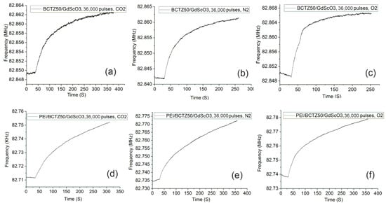 The gas response for the BCTZ50 deposited on GdScO3 substrate by PLD with 36,000 laser pulses without polymer for (a) N2; (b) CO2; (c) O2 and PEI/BCTZ50 for (d) N2; (e) CO2; (f) O2.