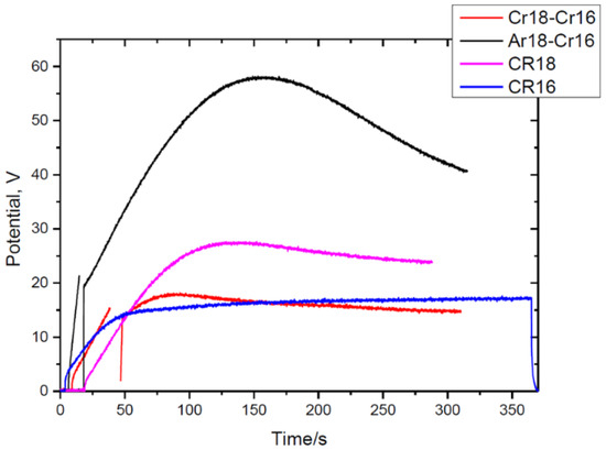Relationship between potential and time of anodising of aluminium for the longest time for the experiments Cr18–Cr16 and Ar18–Cr16, and without interruption in CR16 and CR18.
