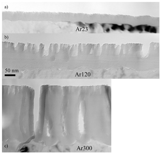 TEM of alumina cross-section following anodizing of ArRef sample at 3 mA/cm2 for 23 s (a), 120 s (b), and 300 s (c) at 3 mA/cm2 in chromic acid (CR16) at 313 K. The scale bar is the same for (a–c).