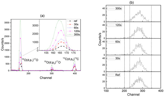 NRA spectra of 16O(d,p)17O reaction for Cr18–Cr16 experiment specimens: CrRef and re-anodised for 30, 60, 120, and 300 s (a) and corresponding NRA spectra of 18O(p, α)15N reaction (b).
