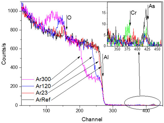 The RBS spectra show reduced arsenic peaks following the immersion (not shown here) and re-anodizing treatments. Immersion for 300 s in the chromic acid led to losses of ~0.5% of oxygen and ~37% of arsenic, which is equal to around 3.7 nm of the film. The arsenate peak widths and location were not altered after re-anodizing, which suggests that arsenic was located near the film surface. The spectra reveal yields from aluminium which widened when re-anodising caused the oxides to thicken. The widths of the oxygen yield also increased. Table 3 reveals that re-anodizing up to 30 V and 60 V, and for 300 s (Figure 2), led to ~67%, 68%, and 71% losses of arsenic (to an accuracy of ±5%), respectively, which indicates both processes, chemical dissolution and field-assisted dissolution, are responsible for the loss of As from the outer part of the layer of the anodic film. The arsenic species are immobile markers and are likely to be ejected at the start of re-anodising when the outward-migrating Al3+ ions are ejected to the electrolyte and the pore development is initiated due to field-assisted ejection. The additional 30–34% loss of As due to re-anodising is in relatively good agreement with the 38–43% porosity of the re-anodised samples calculated from the pore-filling experiment, not presented here. Chromium was only detected in one sample, Ar60V, which indicated an atomic ratio of Cr:Al of <0.001 (Figure 8; Cr and As indicated by arrow in the inception). The absence of a significant chromium content agrees with previous works [25,26,37,38]. The 18O concentration was also reduced by 4.8%, 7.4%, and 6.1% compared to the original concentrations, to an accuracy of ±3%, in Ar23, Ar120, and Ar300, respectively. The loss of the mobile inward 18O tracers might be interdependent phenomena due to (i) over time, the chemical dissolution of the surface of the pore walls in contact with the electrolyte; (ii) migration of oxygen ions inwards within the barrier alumina under the experimental value of the electric field being slower than the theoretical transport number of 0.6; and (iii) the presence of the space charge [39] distribution in the oxide film, which has a dual effect. First, it retards the ejection of Al3+ ions, and second, it prevents O2− ions from migrating inward.