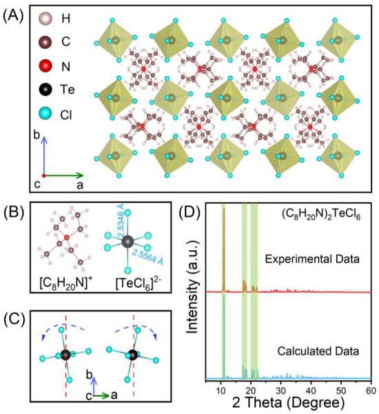 (A) Structural diagram of (C8H20N)2TeCl6 single crystals. (B) The structure of the individual [C8H20N]+ and [TeCl6]2−. (C) [TeCl6]2− octahedral distortion diagram. (D) XRD pattern of (C8H20N)2TeCl6.