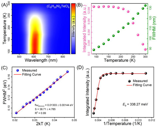 (A) Temperature-dependent PL spectrum of (C8H20N)2TeCl6. (B) Integrated intensity and FWHM as functions of temperature. (C) FWHM2 as functions of 2 kT. (D) Integrated PL intensity as functions of 1/T.