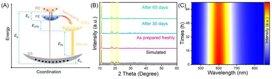 where I(T) and I0 represent the integrated intensity at the actual measurement temperature and the integrated intensity at 0 K, respectively. The Eb of (C8H20N)2TeCl6 was ca. 338.27 meV, which is comparable with the previously reported all-inorganic low-dimensional metal halides of Rb2ScCl5·H2O:Te4+ (384 meV), and CsCu2I3 (346 meV) [27]. The fitted exciton binding energy and Huang–Rhys factor can both prove that this yellow-orange broadband emission at 600 nm in (C8H20N)2TeCl6 halide is attributed to STEs of [TeCl6]2− octahedral [36,37]. Overall, the luminescence mechanism for (C8H20N)2TeCl6 halide (Figure 4A) can be summarized as follows: UV or blue-light excitation leads to the electron excitation from the 1S0 state to the excited states of Te–Cl. Then, the free carriers (FCs) become free excitons (FEs) through coulombic interactions. In addition, the low-dimensional (0D) structure of the (C8H20N)2TeCl6 halide is beneficial for promoting the presence of a soft lattice in this single crystal, thus easily forming STE emission. FEs are subjected to intense exciton–phonon interactions, resulting in lattice distortion of the [TeCl6]2− octahedral and trapping in the STE state. Therefore, FEs ultimately fall into the newly formed STE state, leading to yellow-orange STE emission. Moreover, as shown in Figure 4B, the PXRD peak pattern of the (C8H20N)2TeCl6 sample under long-term air exposure conditions exhibit significant consistency, with several major PXRD peaks corresponding to each other in the highlighted yellow area. And the PL intensity of the (C8H20N)2TeCl6 powder after continuous exposure to 437 nm blue light for 70 h is not significantly different from the original PL intensity (Figure 4C). Hence, the above XRD and spectral results indicate that the as-synthesized (C8H20N)2TeCl6 samples have a reliable stability.