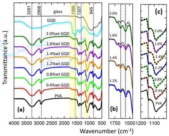 Particularly interesting is the peak at 1141 cm−1, attributed to C–O/C–C stretching modes, which is typically used to evaluate the crystallinity of PVA using FT-IR analysis [31,36,37]. The FT-IR spectra of the pure PVA and PVA/GQD composites in the spectral region from 1200 to 1019 cm−1 are carefully investigated in Figure 3c. There, the FT-IR spectrum for pure PVA (black curve) has been vertically shifted and superimposed (black dotted curves) on the spectra of PVA/GQD with different GQD loadings. As can be seen in Figure 3c, the spectral curves do not change in shape or position as the amount of GQD incorporated into the PVA matrix increases. These results confirm the XRD observations that the percentage crystallinity of pure PVA is not affected by the GQD loading.