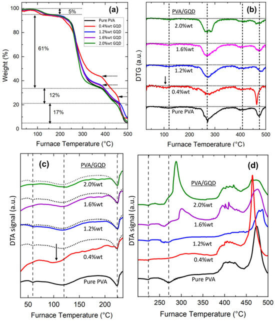 The second degradation stage takes place at temperatures between 200 and 350 °C (Figure 4a,b) and is attributed to the disruption of the intermolecular hydrogen bonding in PVA, with partial chain-stripping elimination reactions (removal of water, with the elimination of hydroxyl side-groups) and chain-scission reactions (formation of free radicals by PVA chain breakage), leading to the formation of polyenes as a result of thermal degradation [42,43]. TGA in Figure 4a indicates again a different behavior for the 0.4%wt GQD sample in this regime. In this case, the bonding of GQDs to the PVA molecules may hinder the chain-stripping reactions, leading to the observed lower degradation rate. For films with higher amount of GQDs, the structures formed by the GQD and the PVA segments may be different, with the GQDs exerting less influence on the degradation rate of the PVA matrix. From Figure 4b, for pure PVA, the maximum weight loss temperature at which the degradation occurs in this second stage is at ~270 °C, at which an endothermic peak appears in the DTA measurements for the pure PVA film (Figure 4d). Interestingly, the DTG curves (Figure 4b) also reveal a small transition in the temperature region corresponding to the melting point, at the onset of this second degradation stage, both for the pure PVA and the PVA/GQD composites. Nevertheless, when analyzing the DTA curves at temperatures close to 270 °C (see the corresponding dashed line in Figure 4d), the response of the different composites is apparently rather different. For GQD concentrations of 1.2%wt and 1.6%wt, the endothermic peak appears shifted to lower temperatures, although the maximum loss peak in Figure 4b remains at the same position. And for the higher GQD contents, i.e., 1.6%wt and 2.0%wt GQD, the DTA reveals the occurrence of an exothermic transition at this temperature, and even more significant exothermic peaks are measured within this temperature range (see Figure 4d). The results in Figure 4d evidence that the presence of GQD alters the reactions taking place during this second stage of PVA degradation. Finally, regarding the third and fourth degradation steps, above 350 °C, reactions giving rise to exothermic peaks in TDA take place (see Figure 4d). At these stages, the occurrence of further degradation and carbonization of PVA backbone structure is expected [44].