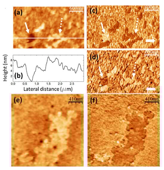 As seen in Figure 8a,c and Figure 5d, the incorporation of a higher amount of GQDs (1.2%wt) leads to the formation of circular “pores” (e.g., those marked by continuous white arrows in Figure 8a,c) with various diameters, up to ~500 nm, and a depth of ~4 nm. In addition to the pores, circular structures with a surrounding annular rim are apparent (e.g., those marked by the dashed white arrows in Figure 8a,c). The internal diameter of such structures is approximately the same size as that of the pores, but their central area is higher than that of the substrate, their structure and origin being presumably common to those of the pores, but the latter being filled by additional molecules. In the circular structure, marked by the dashed white arrow in Figure 8a, the rim is formed by clusters ~125 nm in diameter and ~5 nm in height; a cluster similar to those at the rim is also located in the central region.
