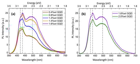 Figure 10 shows the PL spectra of the PVA/GQDs composite films. In PVA/GQD films, the PL response is due to the incorporation of the GQDs and is excitation-dependent [12,14,16]. Our PL measurements were conducted at room temperature, utilizing a 325 nm laser source. No significant PL emission was detected in pure PVA films. As seen in Figure 10, the PL spectra of the PVA/GQD films exhibit maxima at ~420 nm, ~434 nm, and ~495 nm (marked with dashed lines in Figure 10a,b). The PL emission intensity increases as the concentration of GQDs is increased, although in a nonlinear manner. In addition, the PL curves experience significant variations in shape, reflecting that the relative contribution of each spectral component varies with the amount of GQD incorporated into the PVA matrix.