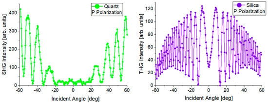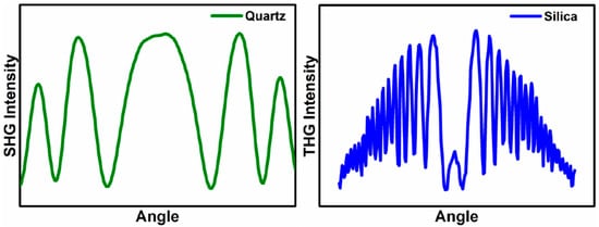 Each measurement series begins with the measurement of reference materials for SHG and THG, which are Y-cut quartz crystal and silica glass, respectively, in the form of 1 mm thick plates. Typical measurement results for reference materials are schematically shown in Figure 4. For this type of measurement, it is important to maintain the symmetry of the signal with respect to the 0° angle. The results obtained for the tested samples are compared with the corresponding results for reference materials. On this basis and thanks to the use of Lee and Kubodera–Kobayashi theoretical models, the nonlinear electrical susceptibility of the tested materials is calculated.