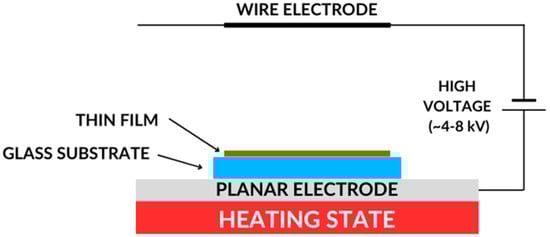 The generation of the second harmonic is closely related to the symmetry of the tested material—the SHG signal is observed only for non-centrosymmetric materials. In the case of centrosymmetric materials, it is possible to produce macroscopic non-centrosymmetry in the test sample. This is carried out using the Corona poling method (Figure 5). Thanks to this method, it becomes possible to observe the SHG signal for a sample for which this signal has not been recorded before.