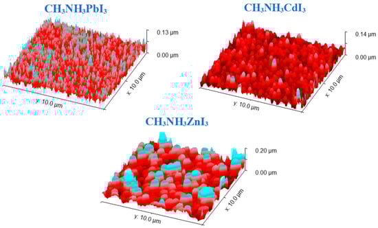 AFM 3D images of perovskite thin films: CH3NH3PbI3, CH3NH3CdI3, CH3NH3ZnI3.